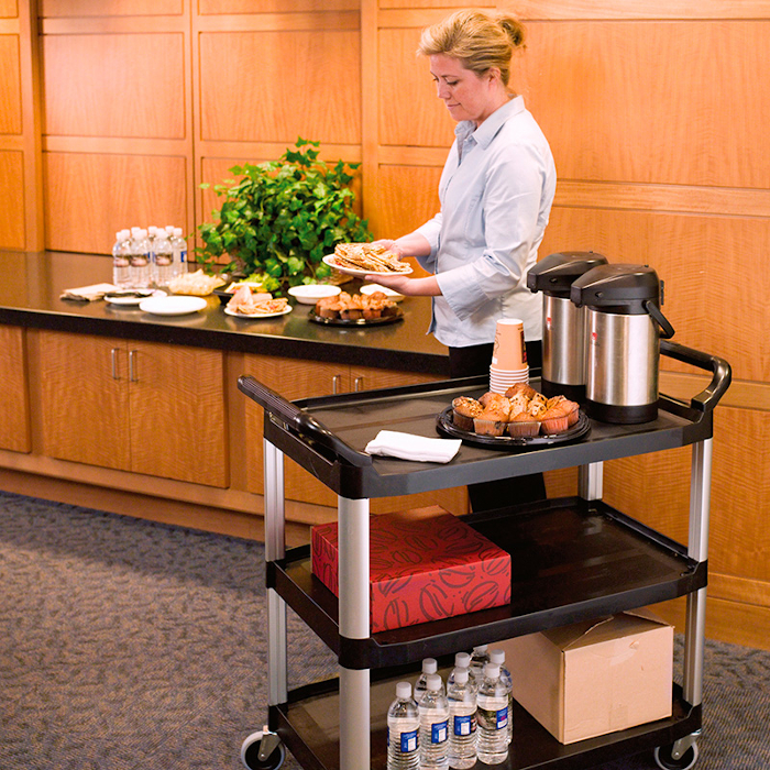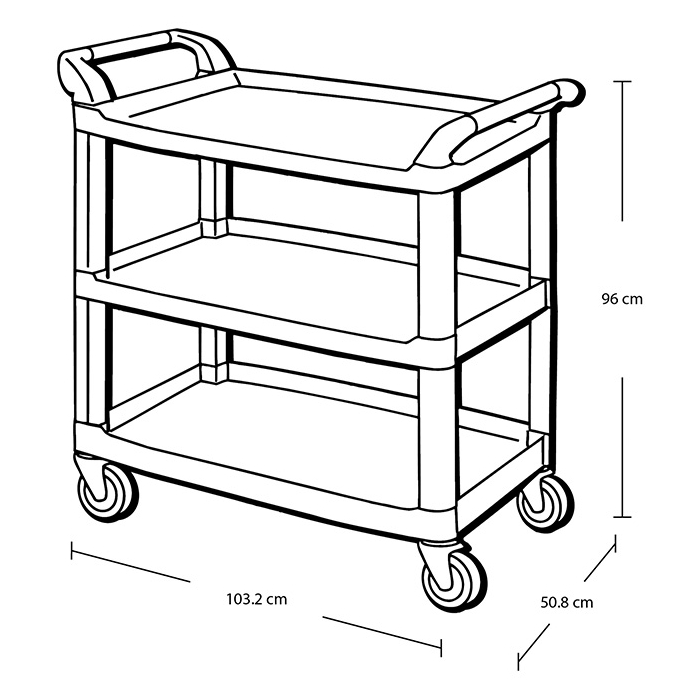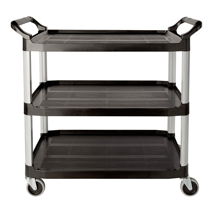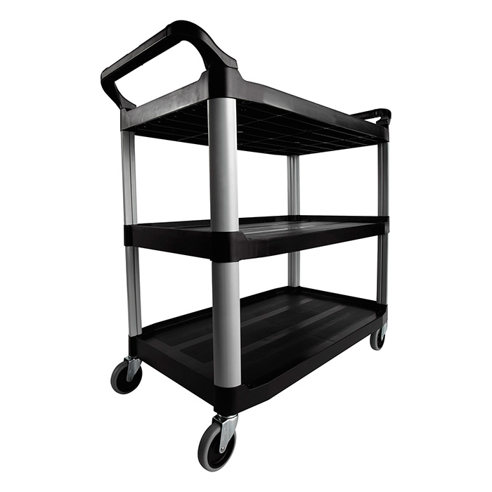 Carro de polipropileno negro de 3 estantes con capacidad para 45 kg/bandeja. Ruedas giratorias antihuella de 10,2 cm Ø. Estructura reforzada.