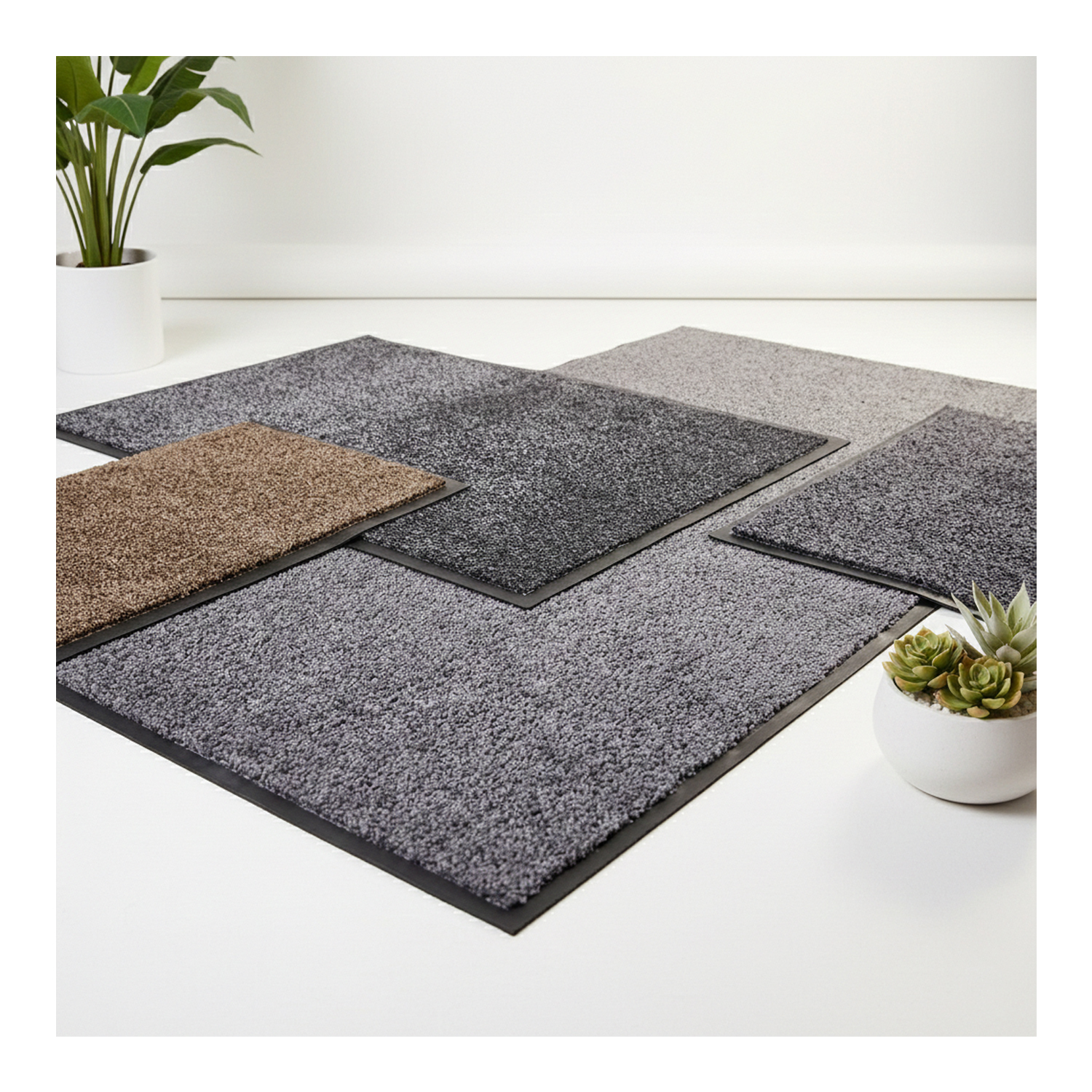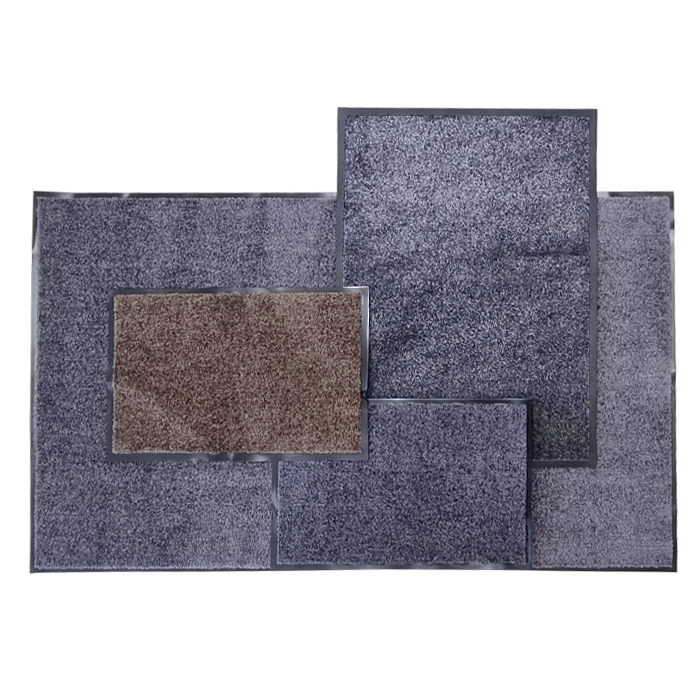 Alfombra de interior gris compuesta por base de PVC flexible con gran adherencia y una capa de tejido turfing torsionado. Zonas con tráfico medio.