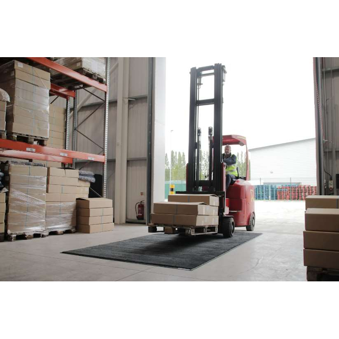 Alfombra extrafuerte para el tráfico de almacenes grandes y pesados, como carretillas elevadoras, elevadores de plumas, transpaletas, apiladores, cargadores laterales y otros equipos con ruedas. Esta alfombra de alta resistencia elimina el agua y la suciedad de las ruedas cuando ingresan en su edificio, manteniendo el suelo de la zona de carga limpio y seco, reduciendo el riesgo de que las ruedas patinen generando accidentes o que los empleados resbalen en un suelo mojado. Esto genera mayor seguridad en la zona de almacenes, también ahorrando tiempo y dinero en la limpieza de los suelos.