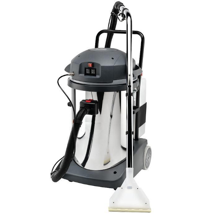 Inyección extracción. 2 motores biestadio. 78 l de capacidad y 1200 w de potencia. Cuadal: 108 l/s. Cuerpo acero inox. Depósito detergente 25 l.