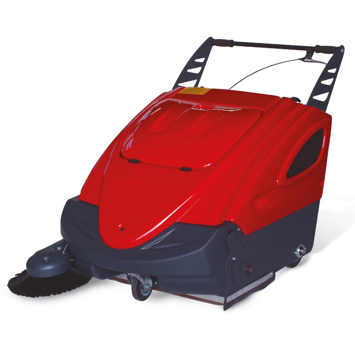 Barredora operador a pie. Productividad: 3720 m2/h. Ancho barrido cepillo central: 710 mm. Ancho barrido cepillo lateral: 880 mm. Cargador y baterías no incluidos. Usar con batería 0703508/0703555/0703565 y cargador 0703578.