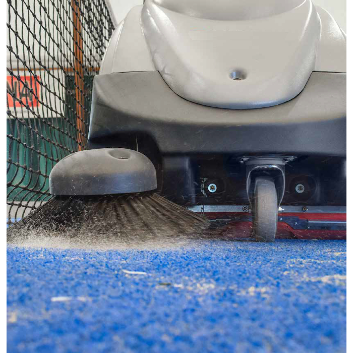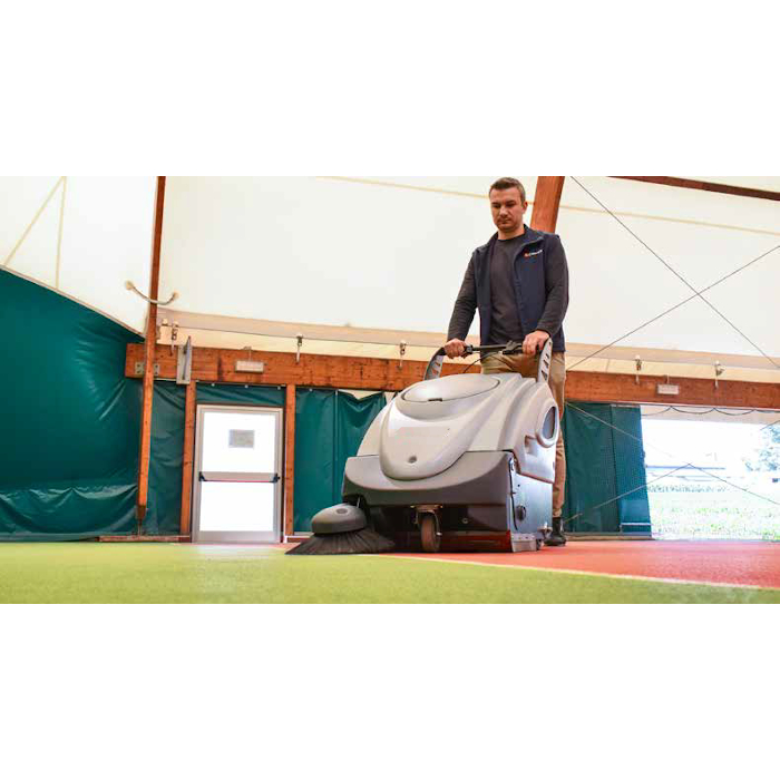 Barredora operador a pie especial pistas de pádel y tenis. Productividad: 2620 m2/h. Ancho barrido cepillo central: 510 mm. Ancho barrido cepillo lateral: 680 mm. Cargador y baterías no incluidos. Usar con batería 0703508/0703555/0703565 y cargador 0703578.