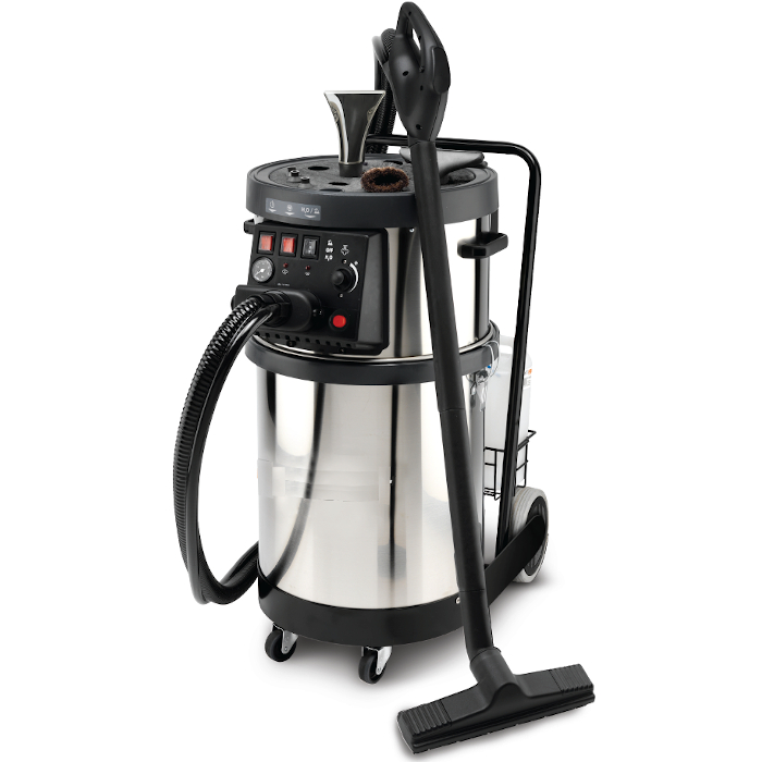 Peso: 34,5 kg. Cuerpo de acero inoxidable AISI 304. Indicador luminoso de vapor listo. Caldera 3kW de acero inoxidable AISI 304 - Espesor 25/10. Indicador de bajo nivel de agua. Alimentación continua de la caldera desde el depósito previsto al efecto. Dispositivo para el uso de productos químicos mezclados con vapor. Dispositivo de lavado con agua caliente mezclada con vapor. Filtro lavable. Tubo flexible 4 m. Capacidad depósito de recuperación 64 l. Tubo de drenaje de líquidos. Regulación del flujo de vapor. Ruedas adecuadas para su uso en ambientes alimentarios. Interruptor principal ON/OFF con indicador luminoso de encendido. Interruptor de la caldera ON/OFF con indicador luminoso de encendido.