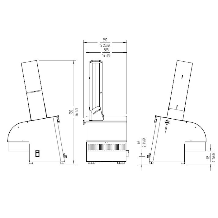 Cortadora de pan para cortar rodajas de espesor regulable. El espesor puede ser entre 20 y 90 mm. Potencia: 250 W.