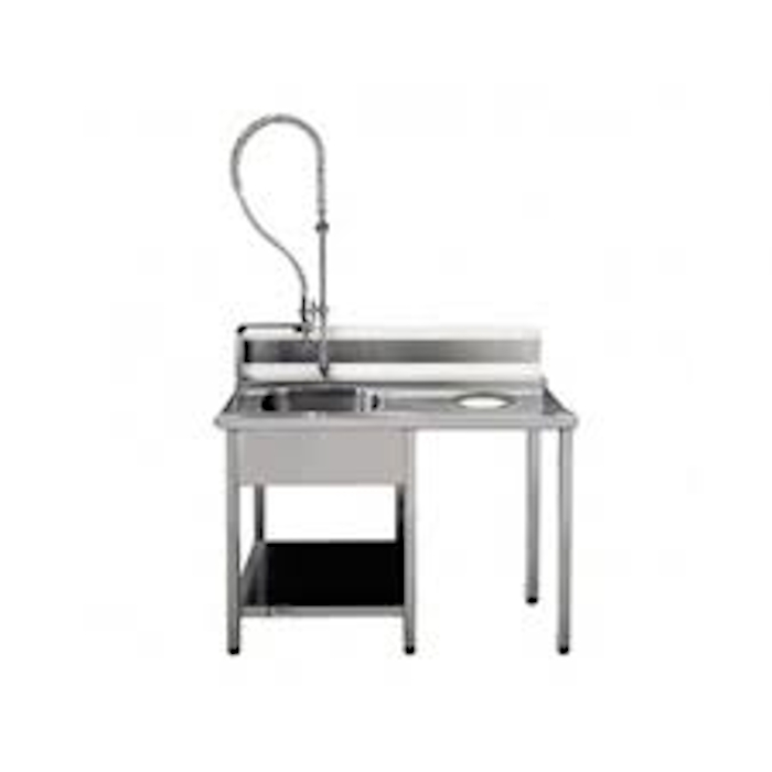 Mesa de prelavado a la derecha para lavavajillas. Fregadero. Grifo ducha. Estante inferior. Peto posterior.