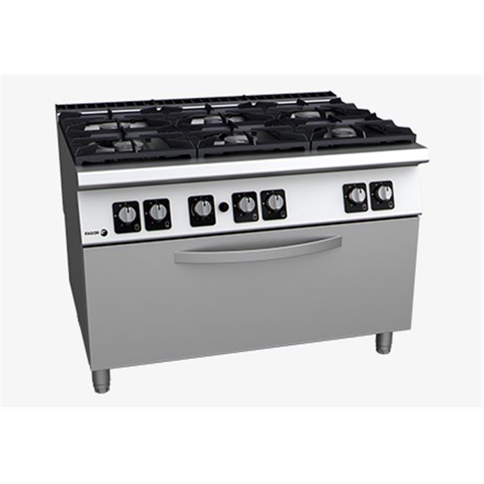 Cocina a gas con fuegos abiertos con horno. 6 quemadores de diferentes potencias y Ø. Horno GN-2/1 y potencia 8,60 kW.