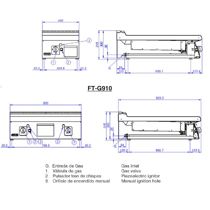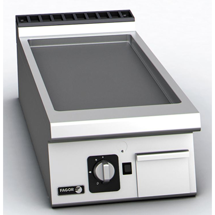 Rapidez de cocinado y uniformidad en el reparto de calor. Cantos redondeados. Plancha de asado integrada en la encimera embutida. Superficie útil de asado: 335 x 640 mm. Calentamiento a gas mediante 1 quemador de dos ramas. Encendido mediante tren de chispas electrónico. Provistas de un orificio para la recogida de las grasas de cocción y de un cajón para su almacenamiento, extraible.