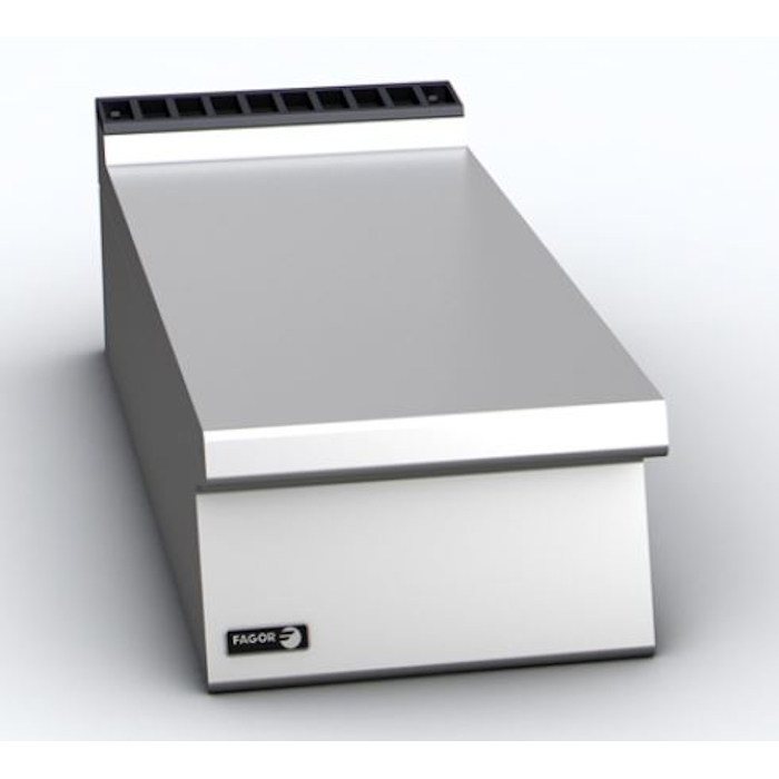 Encimera fabricada en Inox AISI-304 de 2 mm de espesor, con cantos redondeados para una fácil limpieza. Protector de chiminea de hierro fundido espaltado de alta temperatura. Módulos preparados para acoplar un grifo de llenado o columna de agua en su parte posterior.