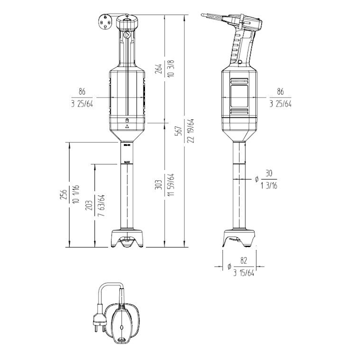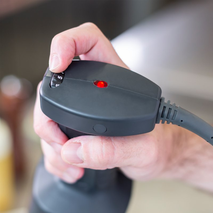Batidora de mano industrial para uso continuo en recipientes de hasta 15 litros. Potencia: 300 W. Velocidad variable.