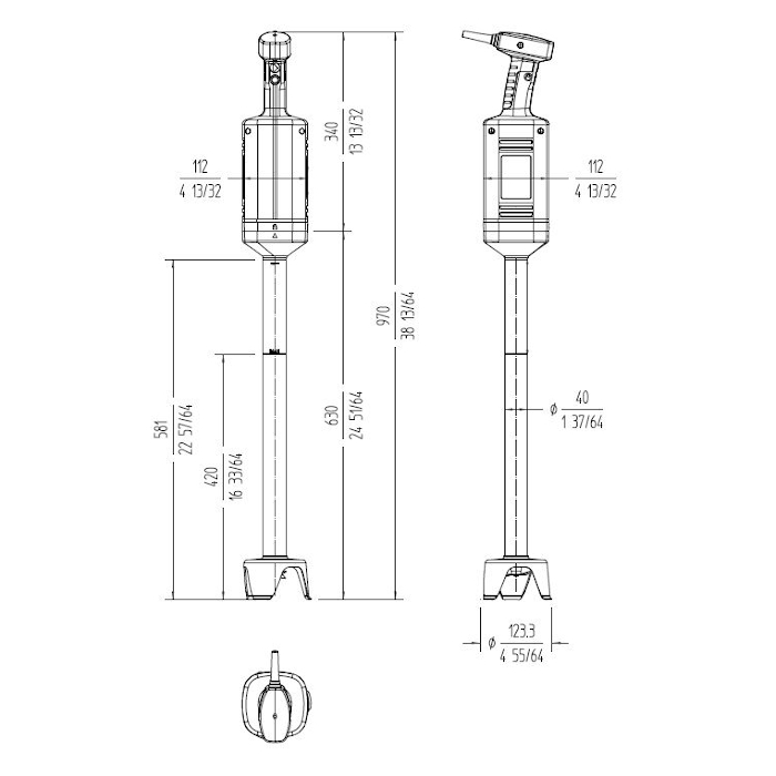Bloque motor de velocidad fija. Brazo extraíble de 630 mm. Peso neto: 5,29 kg. Velocidad motor: 12000 rpm. Diámetro de cubre cuchilla: 123,3 mm. Brazo desmontable, lavable bajo el grifo. Cuchilla de acero templado y filo de larga duración. Carcasa externa realizada en dos materiales para un agarre ergonómico. Grip antideslizante. Inclinación óptima del mango que minimiza la fatiga. Campana diseñada para evitar salpicaduras. Indicador luminoso con led de dos colores para informar del estado de la máquina.