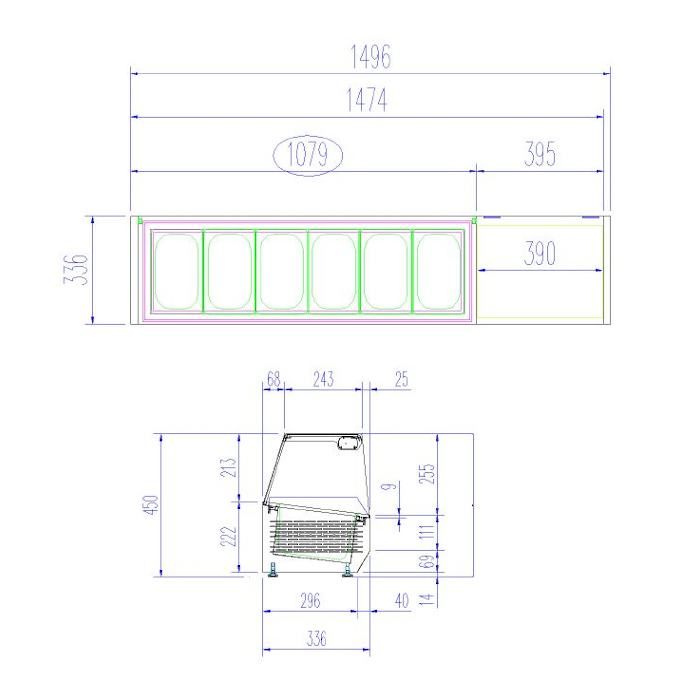 Capacidad para cubetas GN 1/4 de 150 mm de profundidad. Cubetas no incluidas. Grupo frigorífico incorporado. Refrigerante ecológico R-600a. Refrigeración por placa fría. Control termostático de la temperatura (+2 ºC a +8 ºC). Visor digital. Mueble de cubierta de cristal para cubetas GN 1/4.