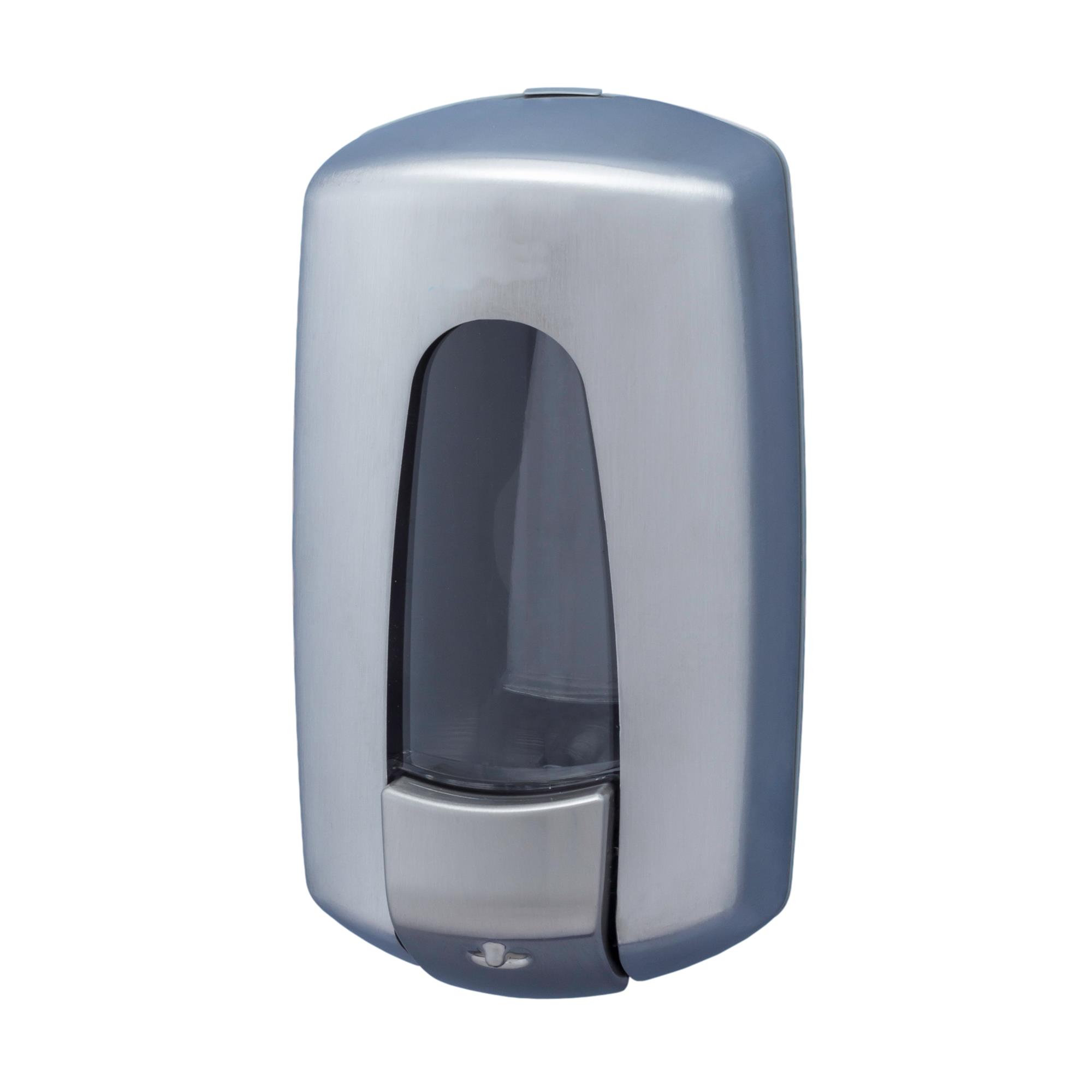 Dosificador de jabón fabricado en acero inox, acabado satinado. Capacidad de 0,9 L. Válvula anticorrosión y antigoteo en el pulsador.