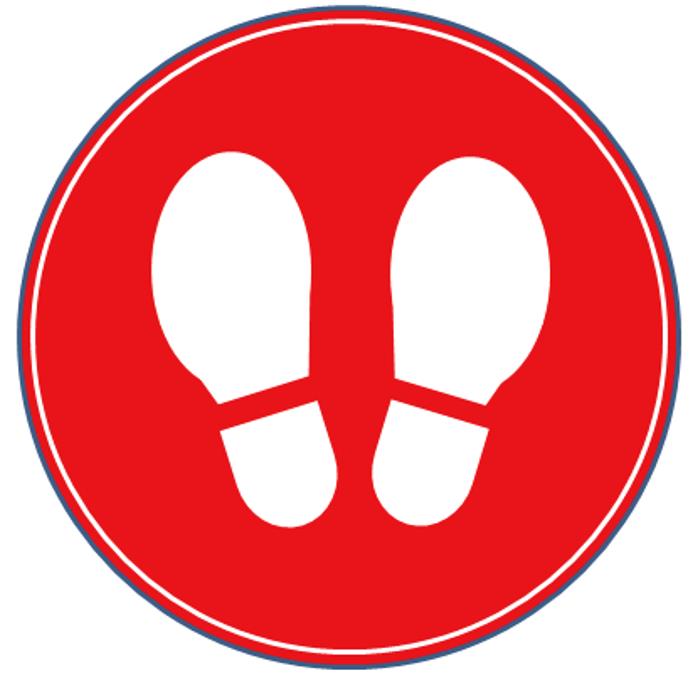 Adhesivo de vinilo redondo rojo con marca de pies blanca para marcar las distancias de seguridad.