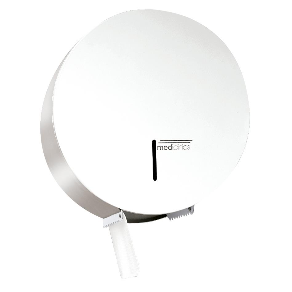 Dispensador de papel higiénico industrial. Fabricado en acero, acabado epoxi blanco. Admite rollos de hasta 275 mm Ø.