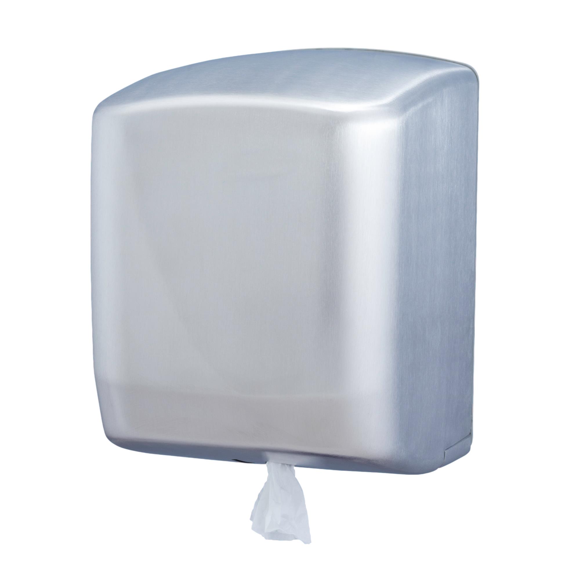 Dispensador box de papel bobina mecha en continuo. Fabricado en acero inoxidable AISI 304 de 0,8 mm de espesor. Base en ABS gris.