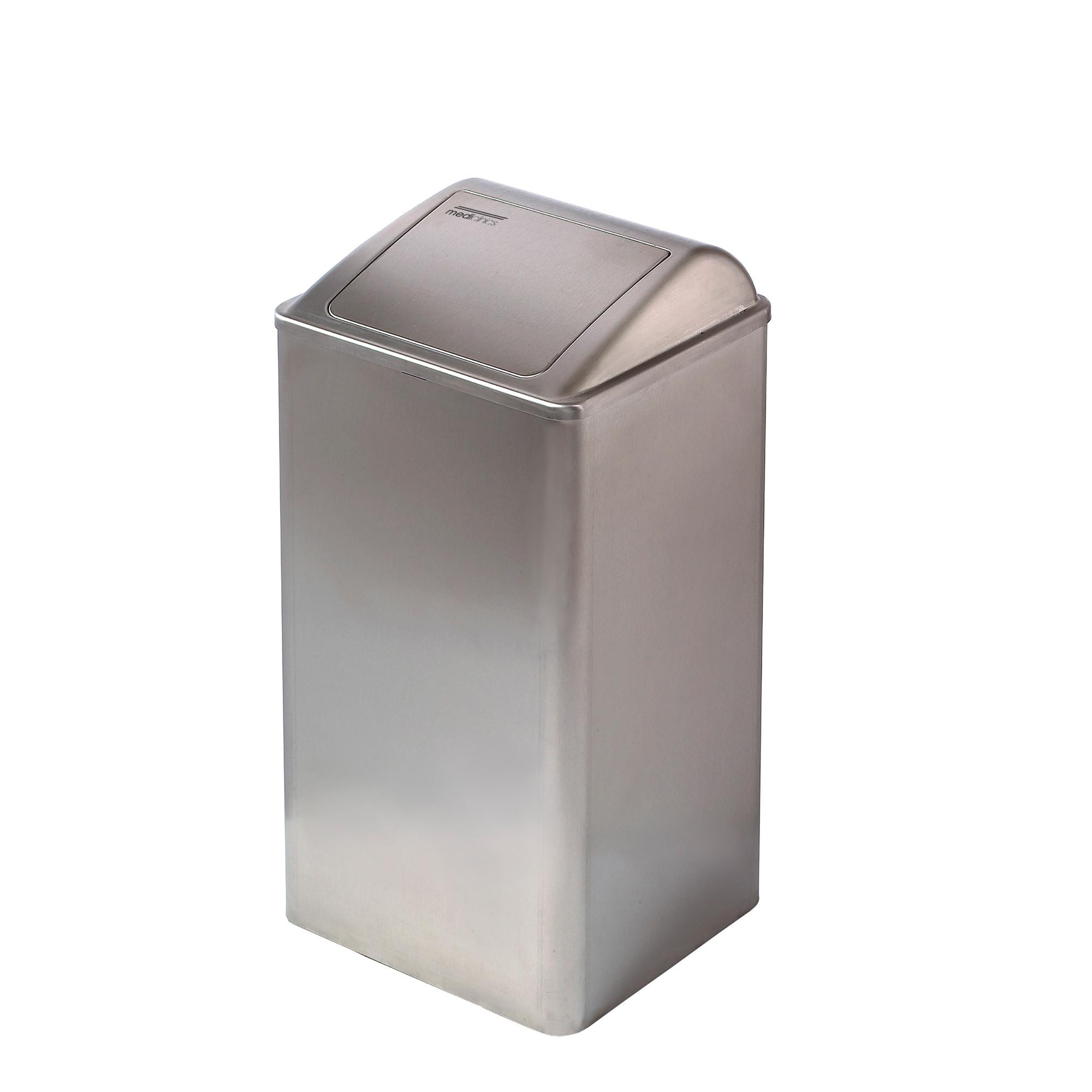 Papelera rectanguar con cabezal con tapa autoretorno de 65 L y de accionamiento manual. Acero inox acabado satinado.