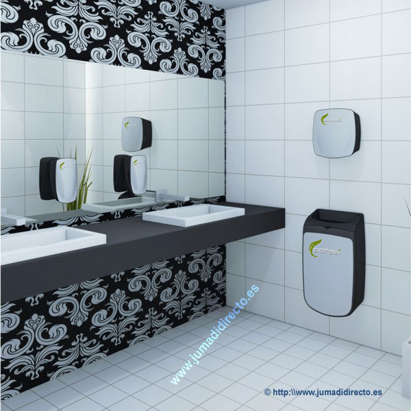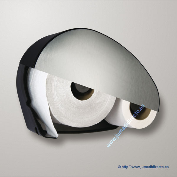 El portarrollos puede acomodar fácilmente un rollo de papel Jumbo junto a uno pequeño de reserva, siendo lo suficientemente pequeño para baños de estrechas dimensiones.