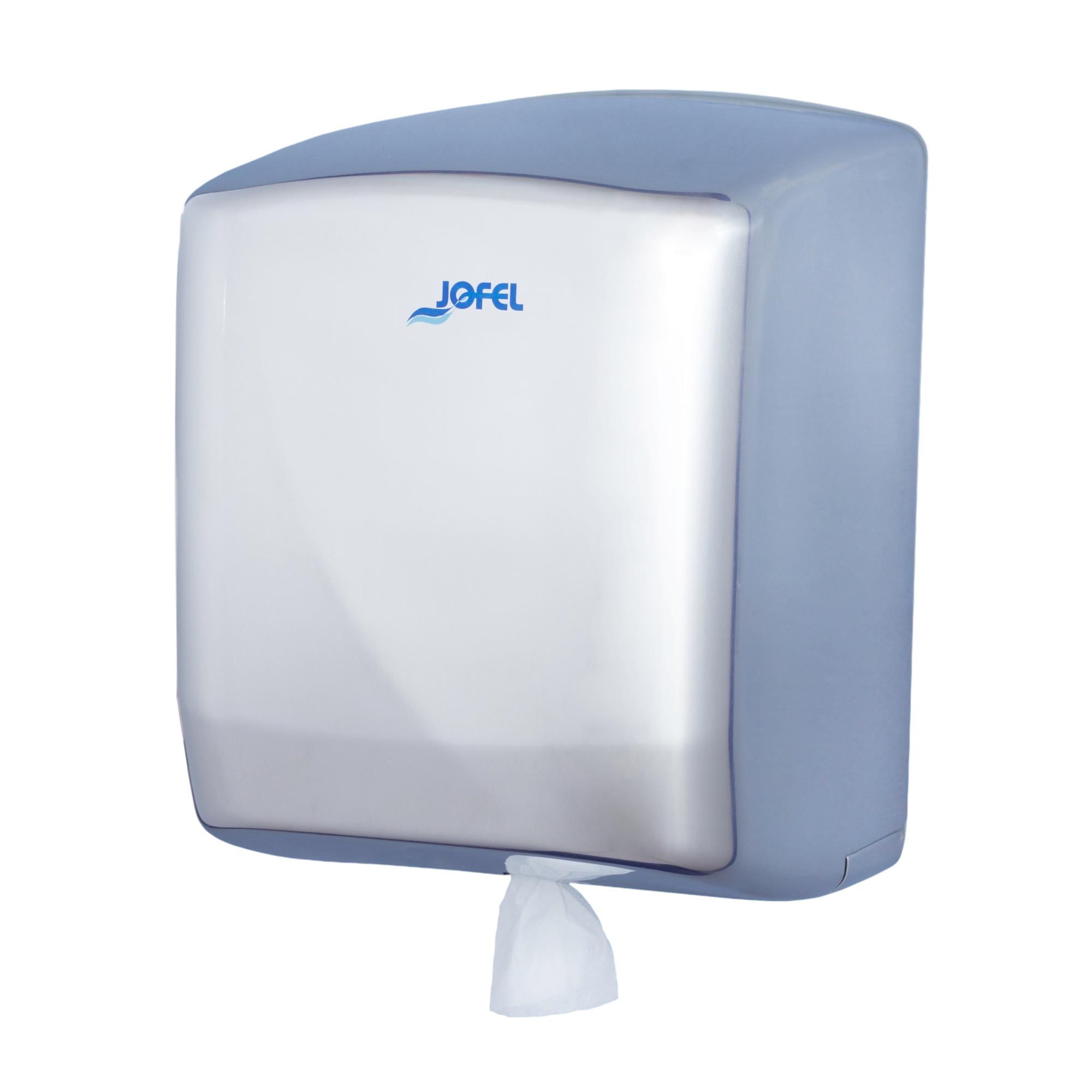 Frontal totalmente abatible para facilitar la carga de papel y cerradura con llave. Requiere bobina especial, apoyada en su lateral y sin mandril para dispensador por el centro de la base. Para bobinas de 205 mm de diametro máximo. Accesorios incluidos: 1 Llave inox de 2 puntos, 4 tacos y 4 Tornillos.