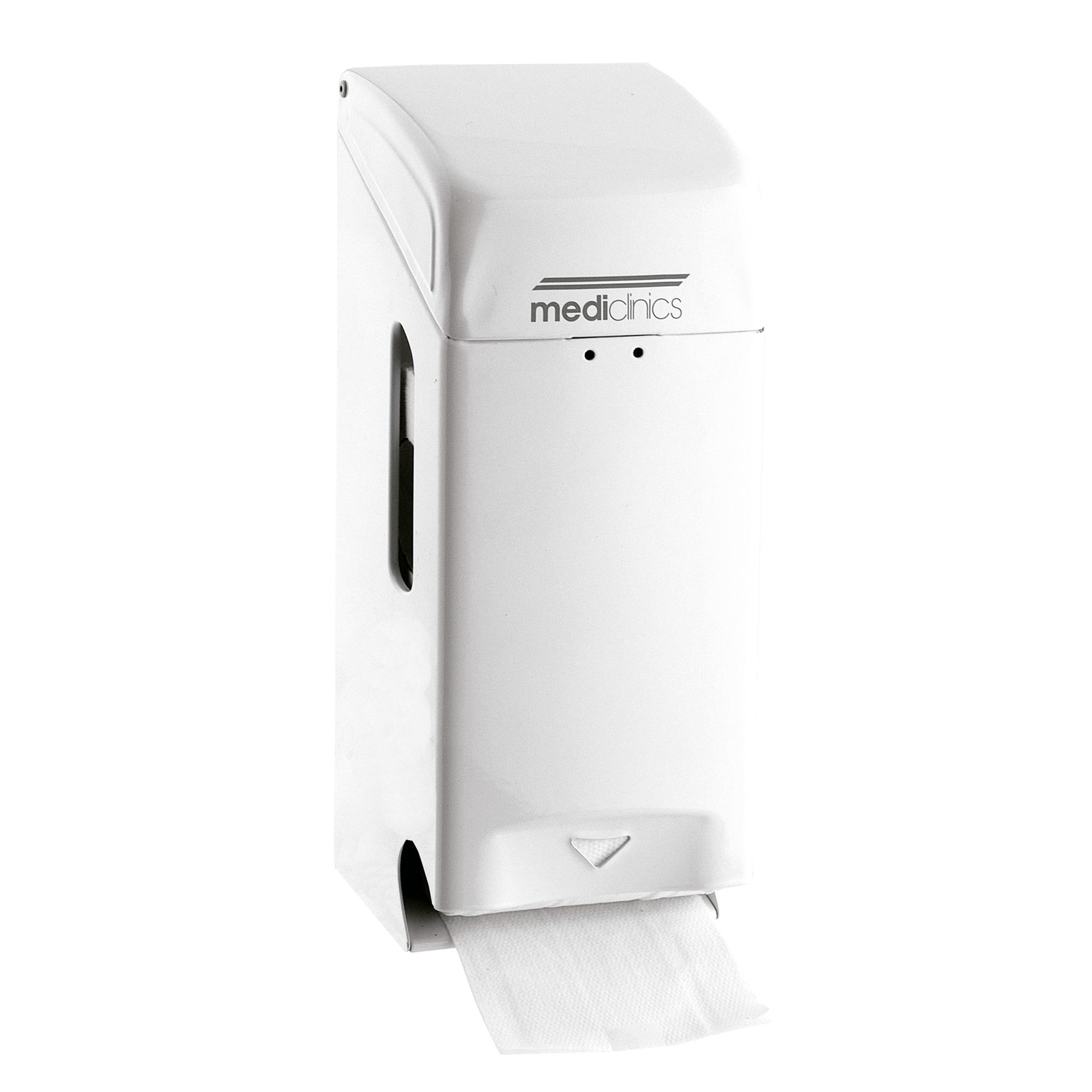 Dispensador de higiénico manual de doble rollo. Fabricado en acero, acabado en epoxi blanco.