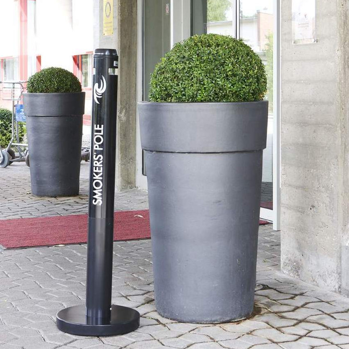 Cenicero de pie negro. Fabricado en aluminio prelacado resistente al fuego y a la interperie. Zona de apagado rebajada y base con peso.