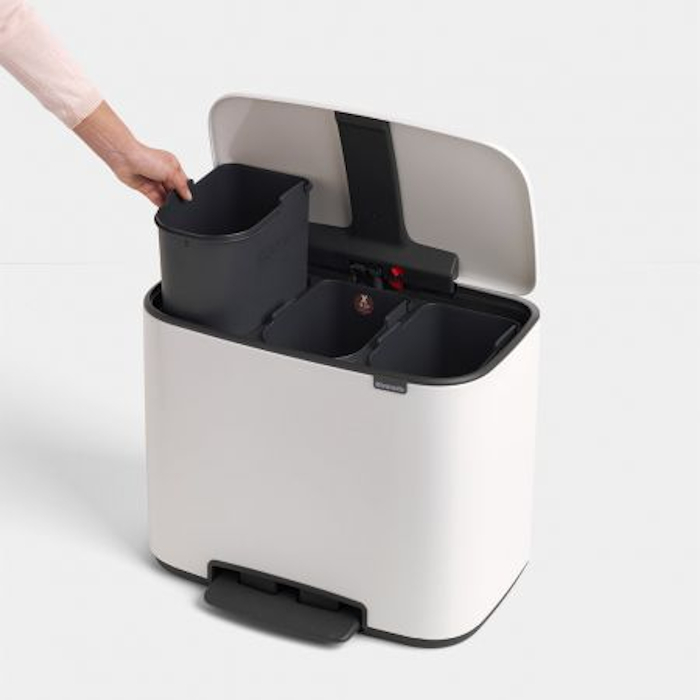 Ideal para la separación de residuos - tres cubos interiores. Ideal para un uso intenso y para sustituir las bolsas - la tapa puede permanecer abierta.