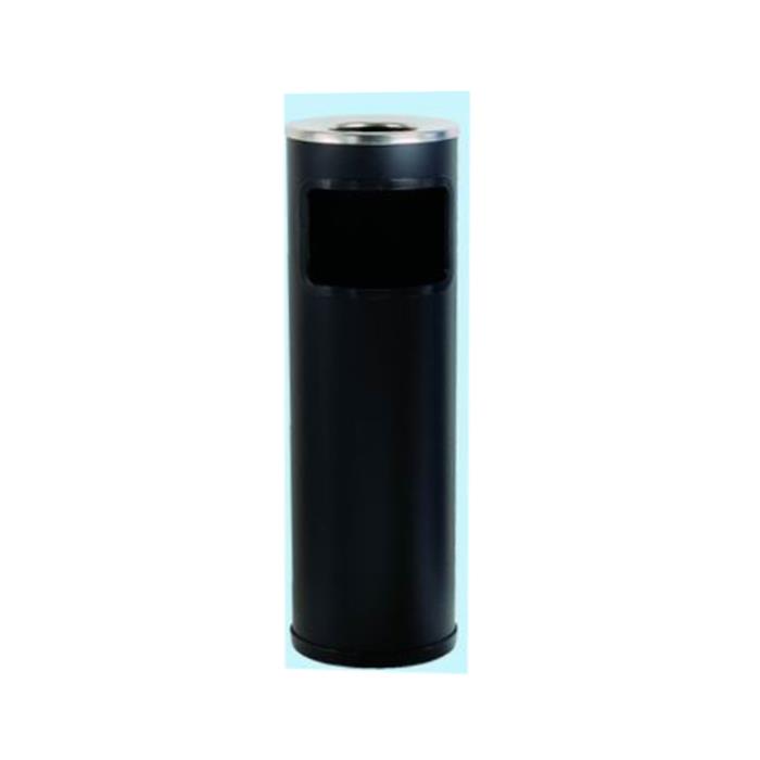 Papelera cenicero negra en plancha de aluzinc de 1mm. Cenicero en aluminio y tapa de acero inox. 18/8 con aro protector.