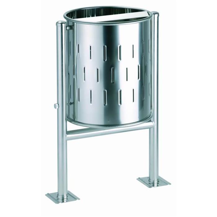 Papelera circular de 60 L en chapa de acero inox. 18/8 troquelada, con cenicero. Fijación al suelo. Basculante.