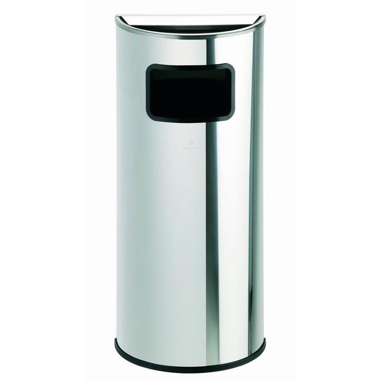 Papelera semicircular de acero inox. 304 18/8 de 0,8 mm de espesor. Con cenicero en acero inox y aro protector en la base.