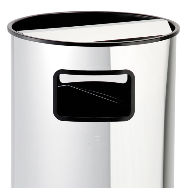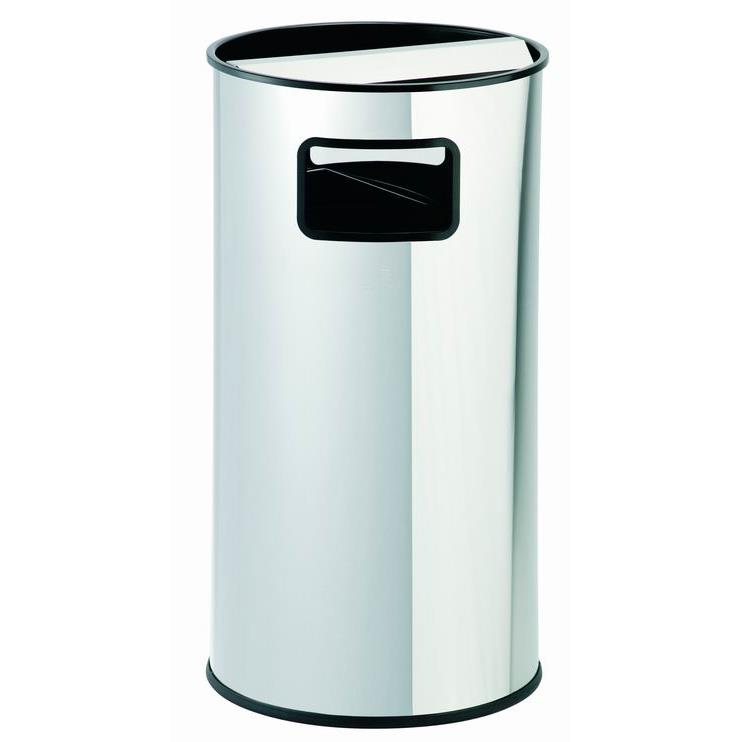 Papelera cenicero en acero inox 18/8 de 0,8 mm con aro protector. Depósito interior de plancha galvanizada.