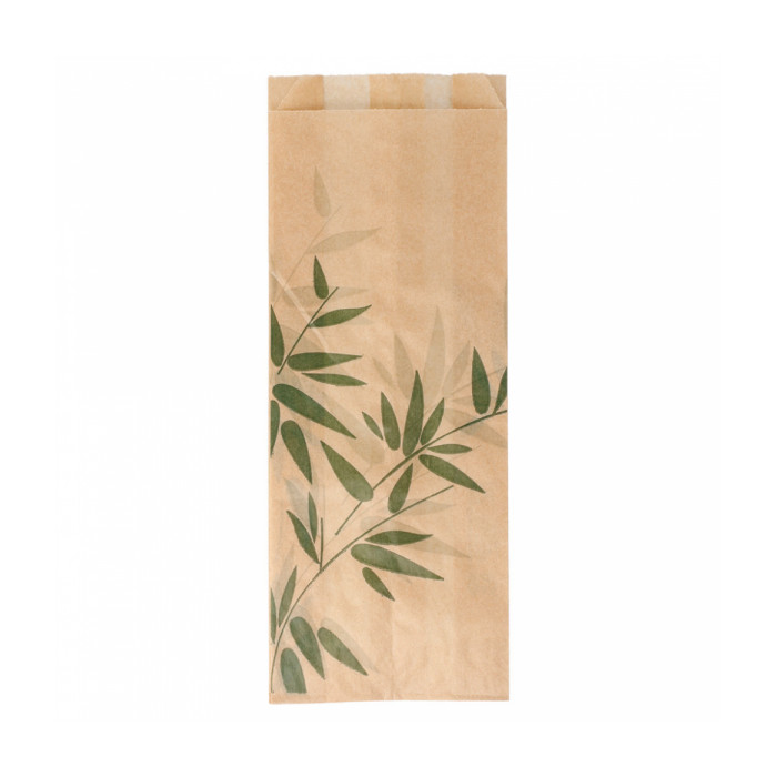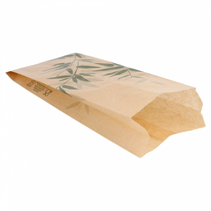 Bolsas Kraft con tratamiento especial antigrasa. Están realizadas en papel Kraft color natural y con papel pergamino antigrasa de 34 g/m2. Gramaje: 34 G/M2. Biodegradable. Reciclable. Tintas compostables. No apto microondas. No apto para horno. Resistente a aceites y grasas.