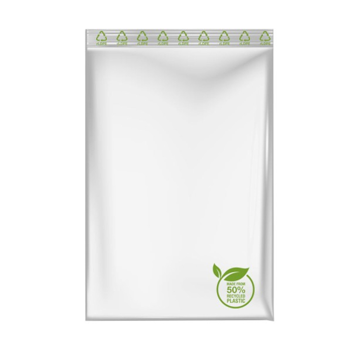 Galga: 200. Espesor: 0,05 mm. Con práctico autocierre. Buena transparencia. Transparente 100%. Flexible. 50% recicladas. Logo 50% reciclado impreso en verde en inglés. Logo rLDPE impreso en verde sobre la banda autocierre.