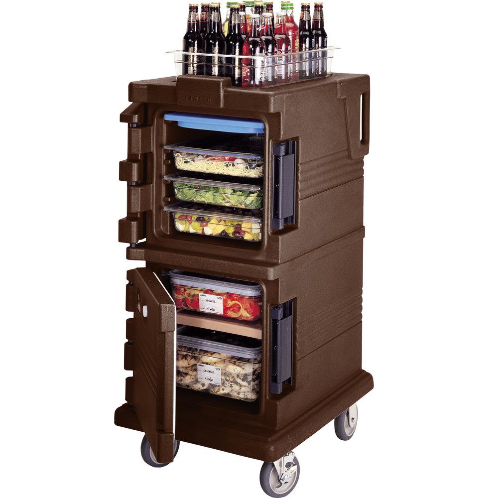 Capacidad: 57 l. Para 4 recipientes GN 1/1 de 20 cm, 6 recipientes GN 1/1 de 15 cm, 8 recipientes GN 1/1 de 10 cm ó 12 recipientes GN 1/1 de 6,5 cm. Construidos en armazón de polietileno y espeso aislante de hule espuma. Con juntas herméticas desmontables. Cierres de nylon. Las puertas se abren completamente hasta los costados. Tienen asas premoldeadas para una mayor maniobrabilidad. Esquinas premoldeadas para minimizar daños en paredes, muebles y otros equipos. Ruedas de 15,2 cm, 2 fijas traseras, y 2 giratorias delanteras, una con freno.