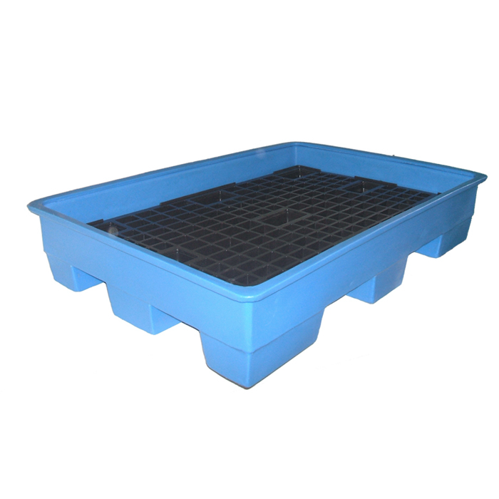 Material: Polietileno rotomoldeado. Resistente a corrosión y trato duro. Apilable entre sí. Bandeja rígida, soporta contenedores GRG metálicos con patas de apoyo sin que se produzca inclinación alguna durante las operaciones de llenado y vaciado.
