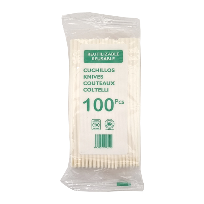 Cuchillos de poliestireno en color crema, reutilizable hasta 20 lavados. Proceso de transformación por inyección.