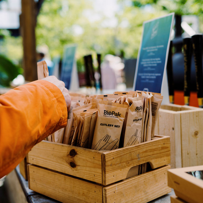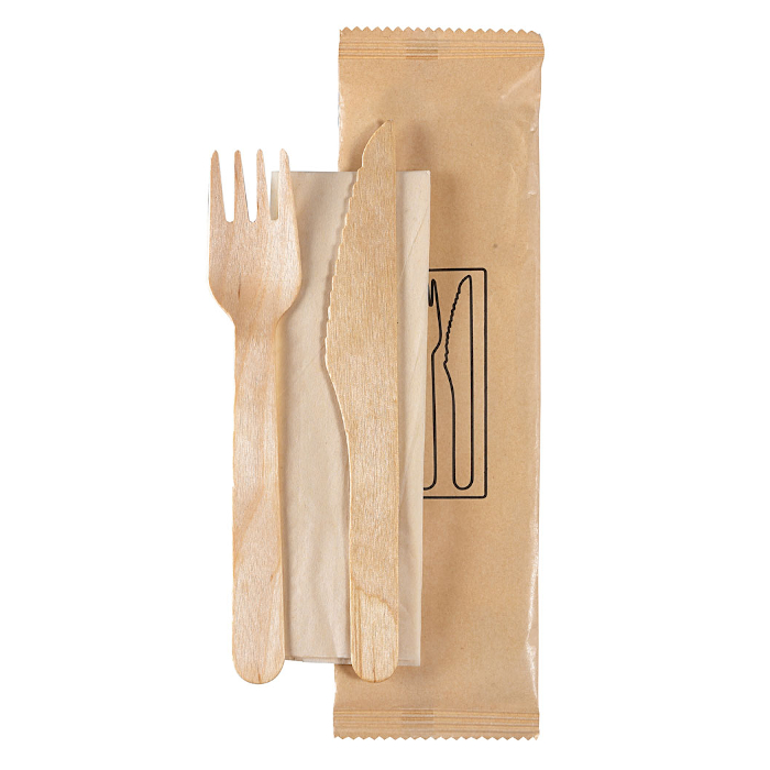 Solución de cubiertos higiénicamente segura e ideal para llevar. Servilleta 16x16,5 cm natural. Cuchillo y tenedor madera de abedul.