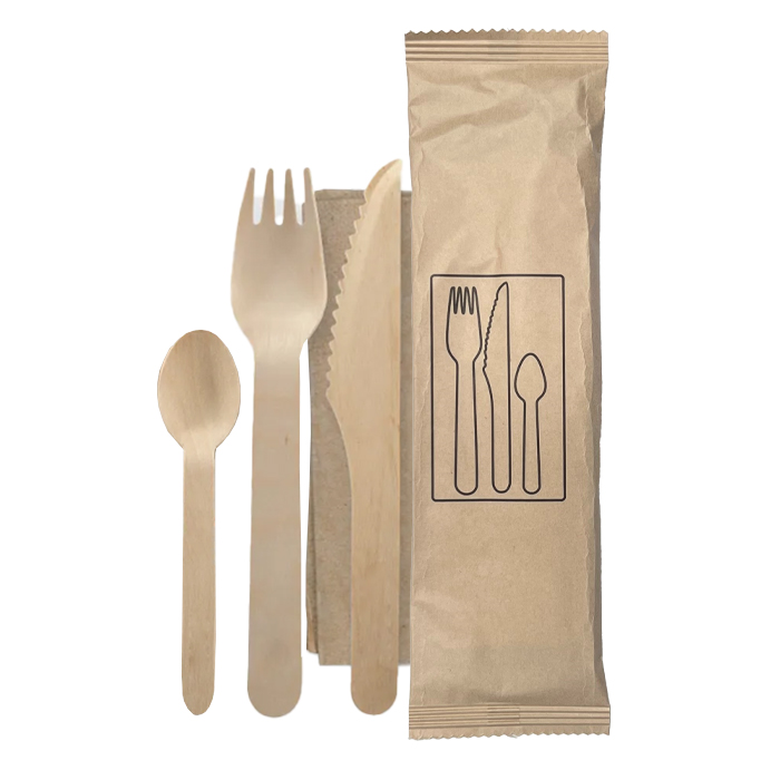 Set cubiertos madera de abedul natural con cuchillo 16 cm, tenedor 16,5 cm y cucharilla 11 cm. Incluye servilleta de celulosa marrón.