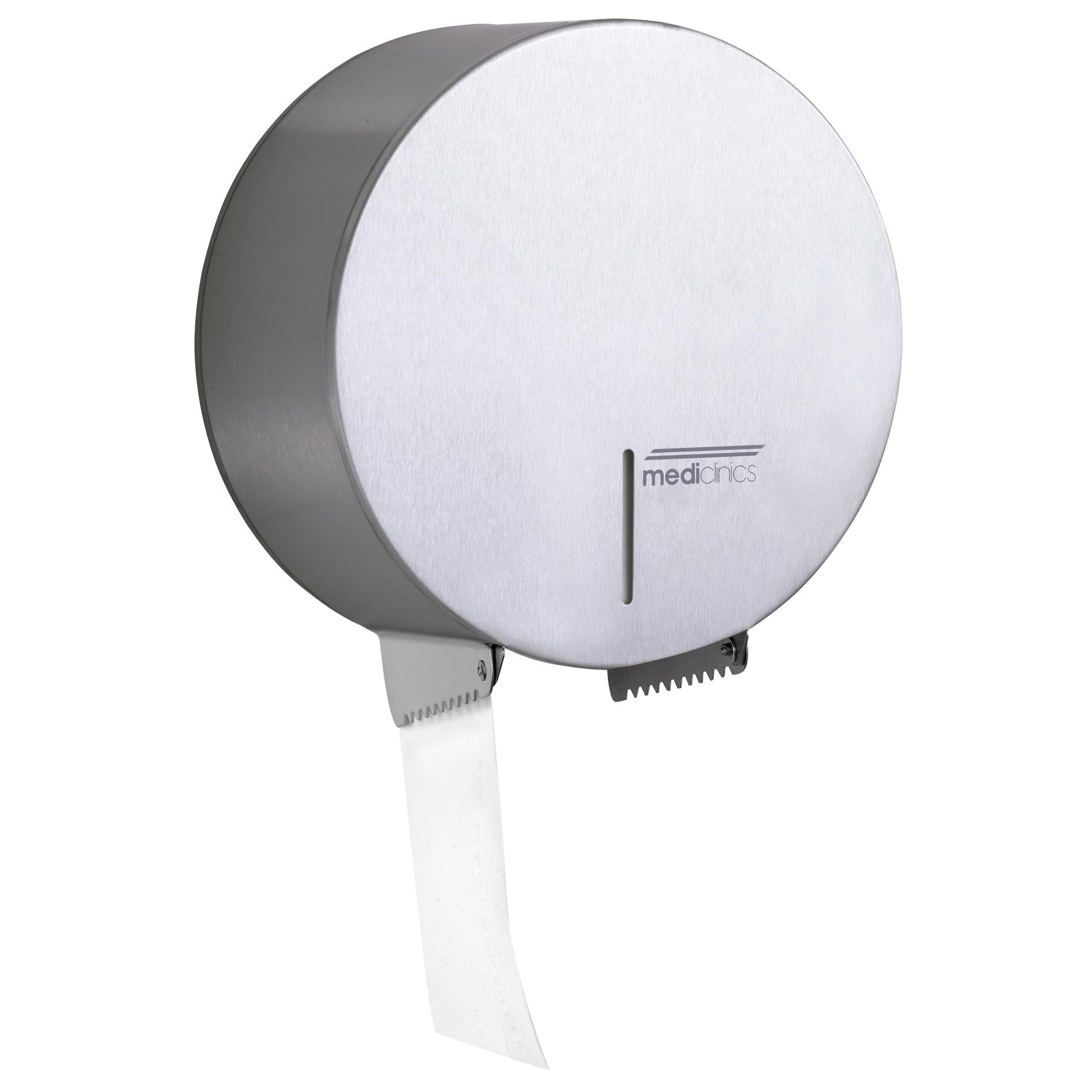 Dispensador de papel higiénico industrial. Fabricado en acero inox. AISI 304, acabado satinado. Admite rollos de hasta 275 mm Ø.