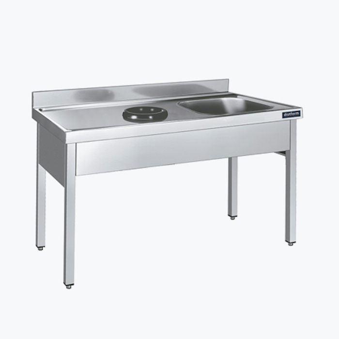 Peto posterior de 105 mm y frontal de 65 mm en punto redondo sanitario, totalmente soldados. Cubeta embutida con válvula de desagüe y tubo rebosadero incluidos. Agujero de desbarace con aro de goma para tirar los desperdicios directamente a un cubo de basura situado bajo la encimera. Patas cuadradas de acero inoxidable de 40 x 40 mm para elevar la altura desde los 850 hasta los 920 mm.