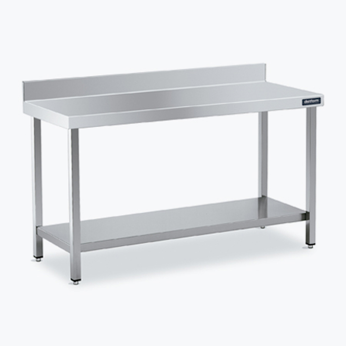 Peto posterior de 105 mm y frontal de 65 mm en punto redondo sanitario, totalmente soldados. Patas cuadradas de acero inoxidable de 40 x 40 mm para elevar la altura desde los 850 hasta los 920 mm.