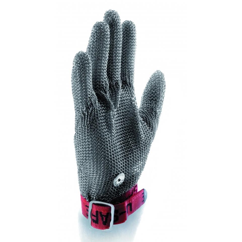 Guante de acero inox cinco dedos con correa extraible naranja en la muñeca. Ambidiestro.