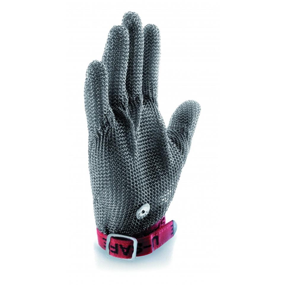 Guante de acero inox cinco dedos con correa extraible azul en la muñeca. Ambidiestro.