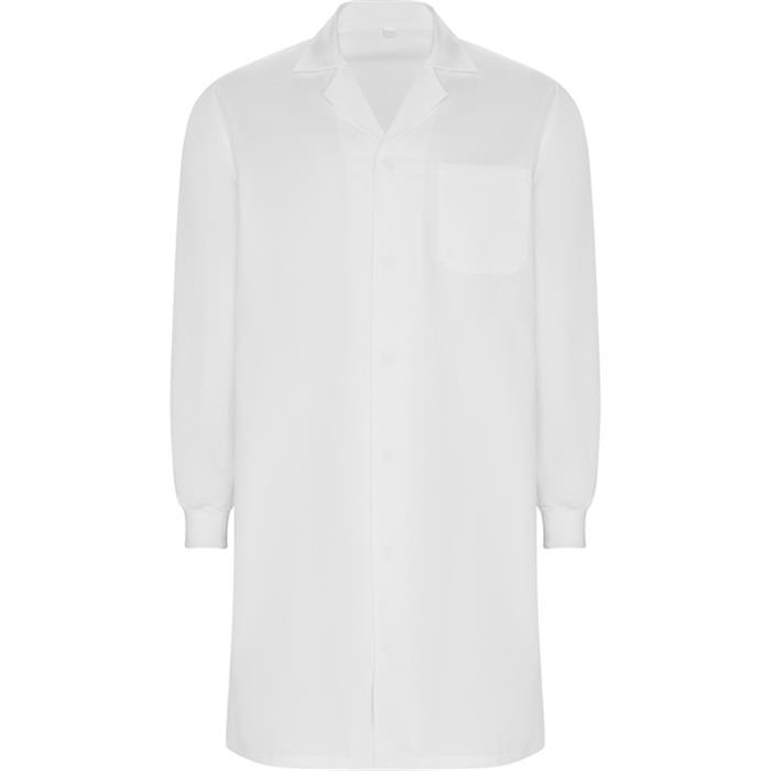 Bata unisex de laboratorio con solapa. Apertura frontal con botones metálicos antioxidantes a presión ocultos en la tapeta delantera. Bolsillo interno en pecho izquierdo. Puños en rib 1x1.