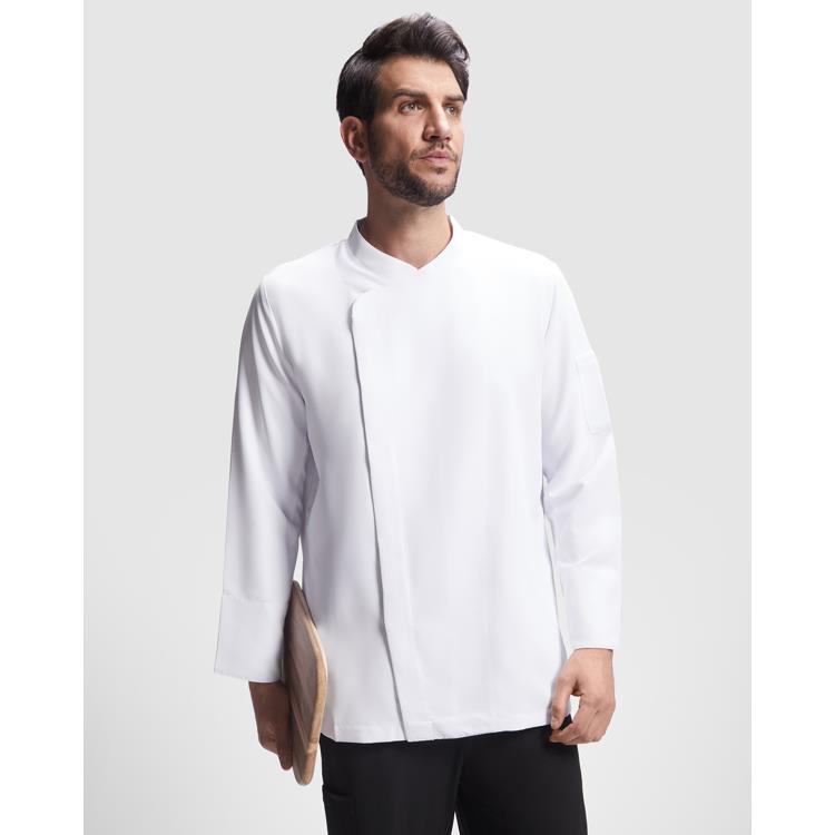 Chaqueta de cocina unisex. Escote cruzado a la derecha con botones a presión ocultos en la vista delantera. Sisas y espalda en tejido transpirable. Manga sastre con puños vueltos. Bolsillo plaqué en manga izquierda. Etiquetado Roly WRK exterior.