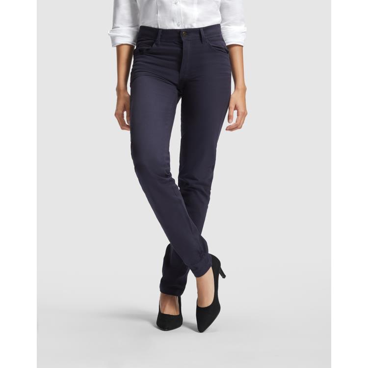 Pantalón largo mujer. Tejido stretch. Cierre con cremallera y botón metálico personalizado. Trabillas en la cintura para cinturón. Bolsillos frontales a la cadera. Dos bolsillos traseros de ojal con botón.