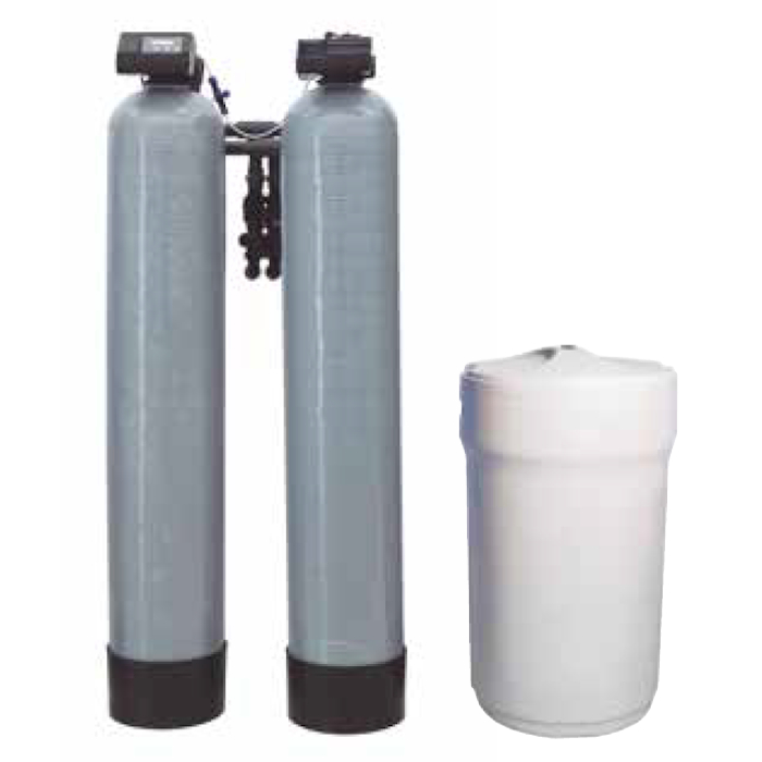 Ideal para aguas de alta dureza y trabajos en continuo. 2 Botellas en PRFV con distribuidores superiores e inferiores y depósito sal PE.
